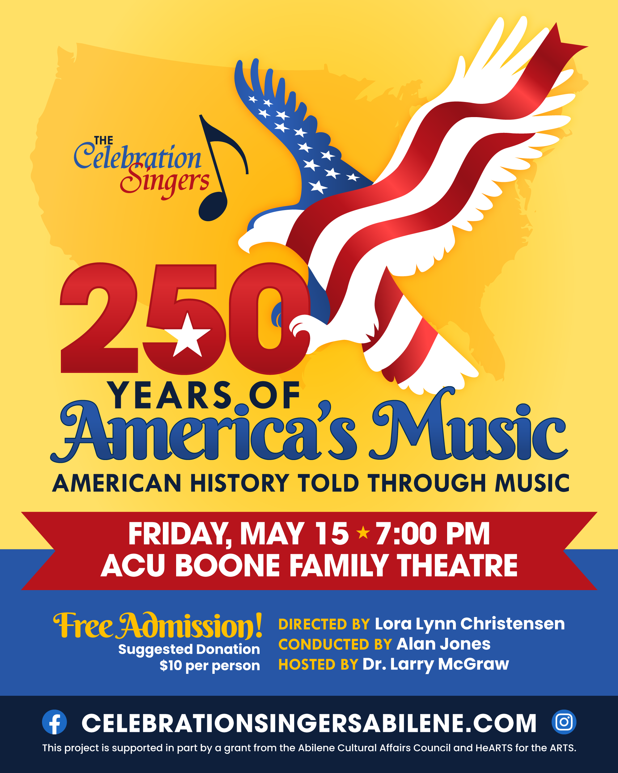 From war songs to inspirational hymns, America's music is as diverse as the country itself. The Celebration Singers will perform a variety of patriotic songs while smaller ensembles--and even our kids--share historic tales, folks songs, and spiritual numbers. We hope you'll make plans to join us as we share in America's 250 year!